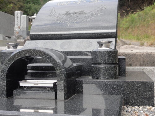 伝統的な和型のお墓です。2重台と3重台があり、前の花立、水鉢の形状によって、神戸型、大阪型が主な形となります。上台の正面に彫刻してある「蓮華彫刻」はおおきた石材店オリジナル。石材店ごとにデザインが違い、どの石材店か判断することも可能です。