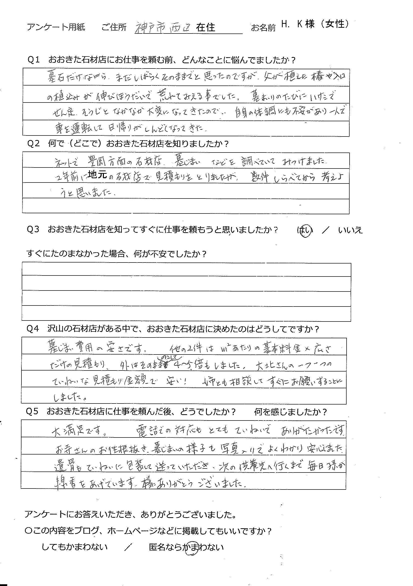 あ、そういえば、でも初めてではないかも。。。以前、お墓じまいしたお客様から「お客様の声」頂いたこと、あったな。。。