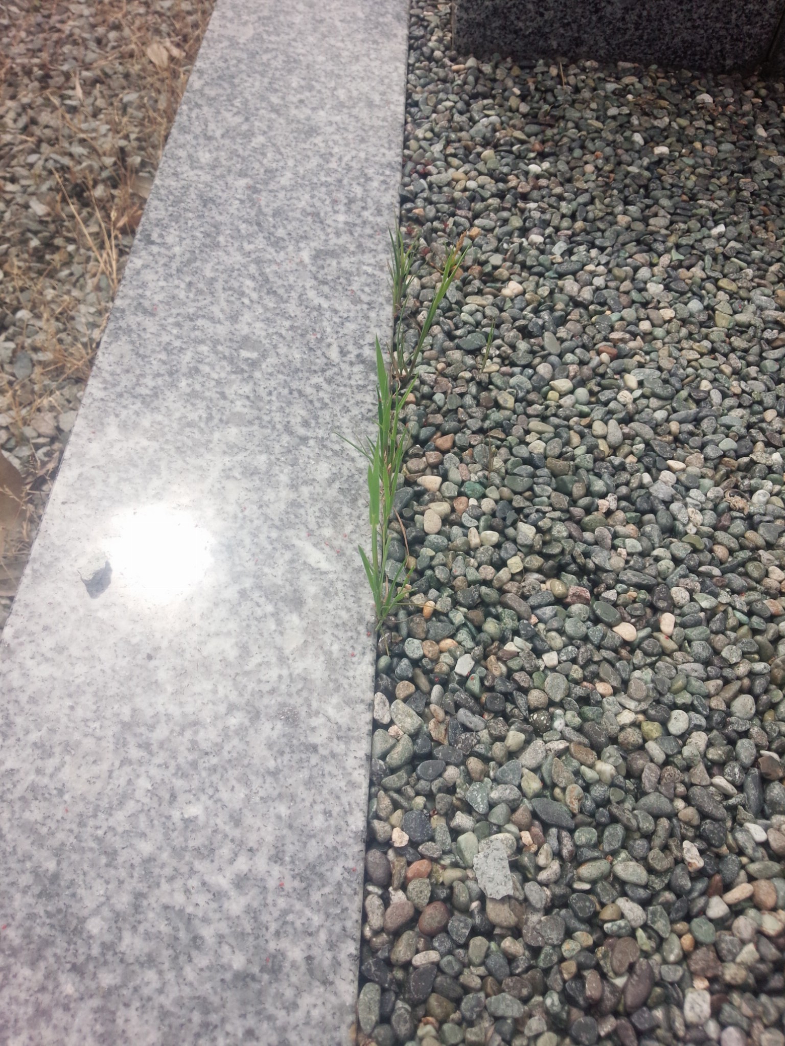 これもそう。草が砂利のすき間に入り込んで、隙間から樹木のように値を張り出して、草になったようです。いずれも樹脂が完全に劣化してなくなっているように見えます。このように、樹脂がなくなってくると、草が生えだすことがあります。しかも、これはまだ序の口。草がぼうぼうの樹脂施工のお墓もあるのです。こうなると、防草対策とは呼べない気がするのは私だけでしょうか?