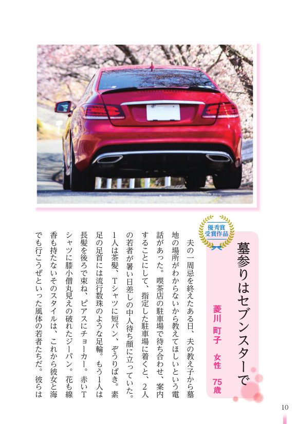 茶髪にぞうりばき、ピアスにチョーカーの2人の若者と一緒に亡くなったご主人のお墓参りに行く女性のものがたりです。