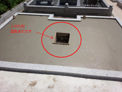 その上に、焼骨を納める部分(カロートと呼びます)には、コンクリートをしておりません。この部分だけコンクリートに穴を開けて、下の地面(土)が見える状態にしています。つまり土の上に焼骨を安置するわけです。この穴のことを俗に「息抜き穴」と呼びます。