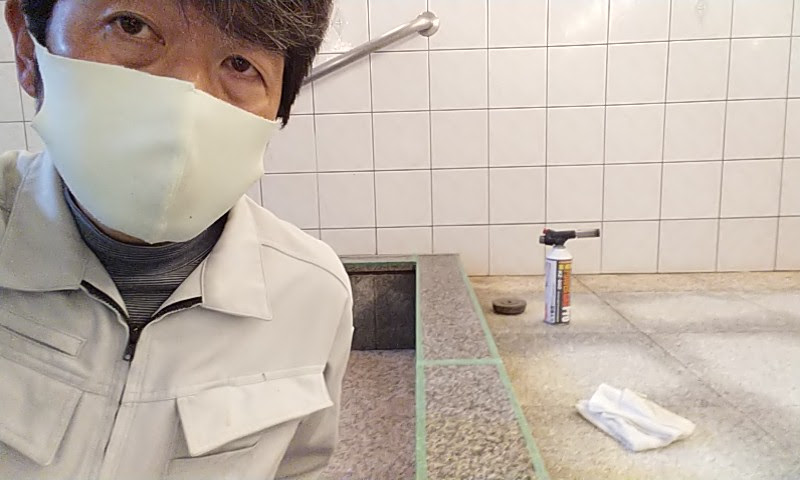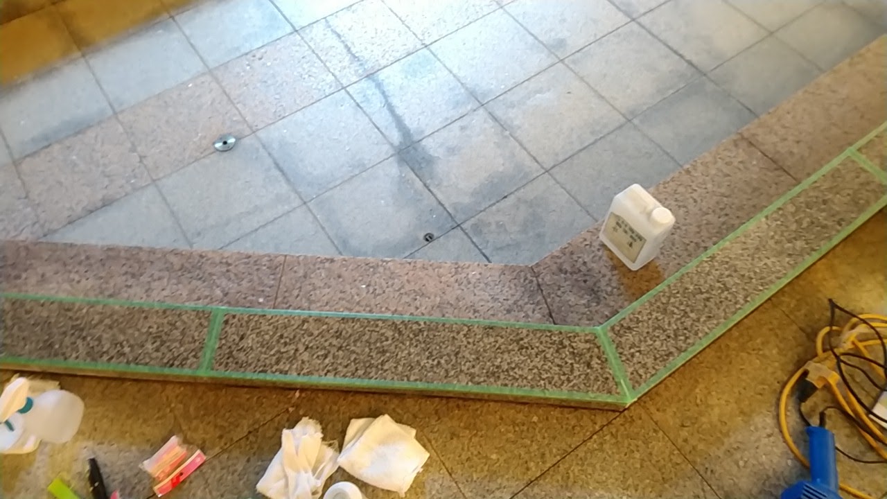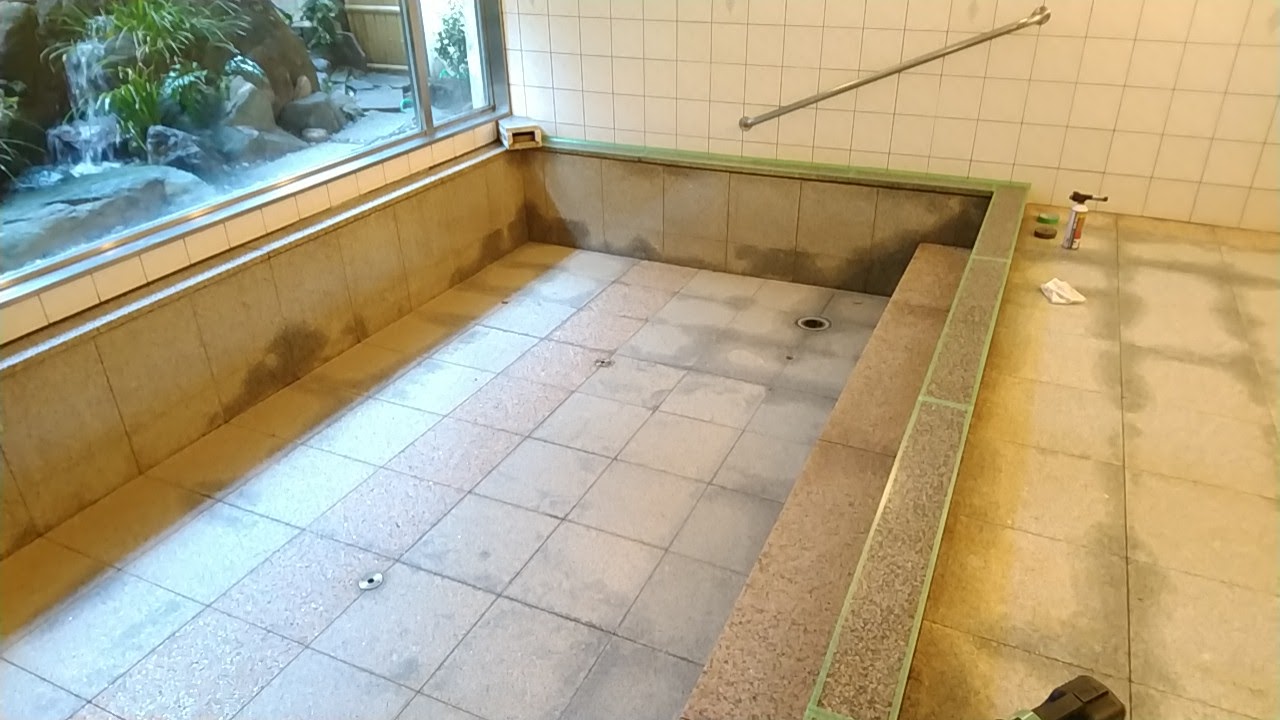 通常、玄関回りとかお墓の参拝する部分など屋外で雨などでぬれると滑る部分の表面に施工するのですが、今回は浴槽。しかも、大浴場で24時間お湯が流れている状態です。条件としては最悪の環境です。ここでどの程度持つのかは、不安です。その点は施主様にご連絡してありますが。。。