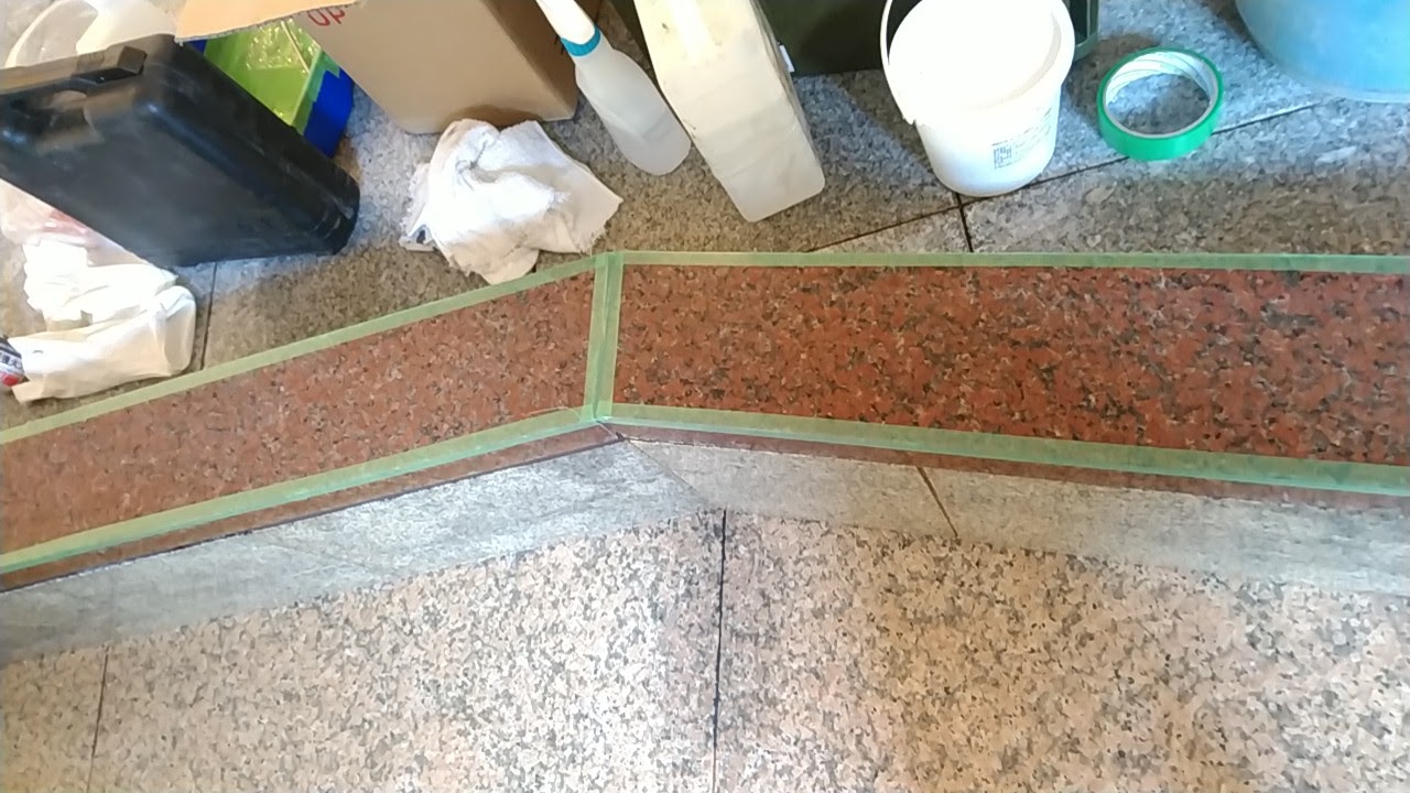 下地になる石の表面の汚れを落とし、下から水分が上がってくると剥がれてしまい、施工不良となるので、下地の石に防水処理し、乾いたらシールして、準備完了。