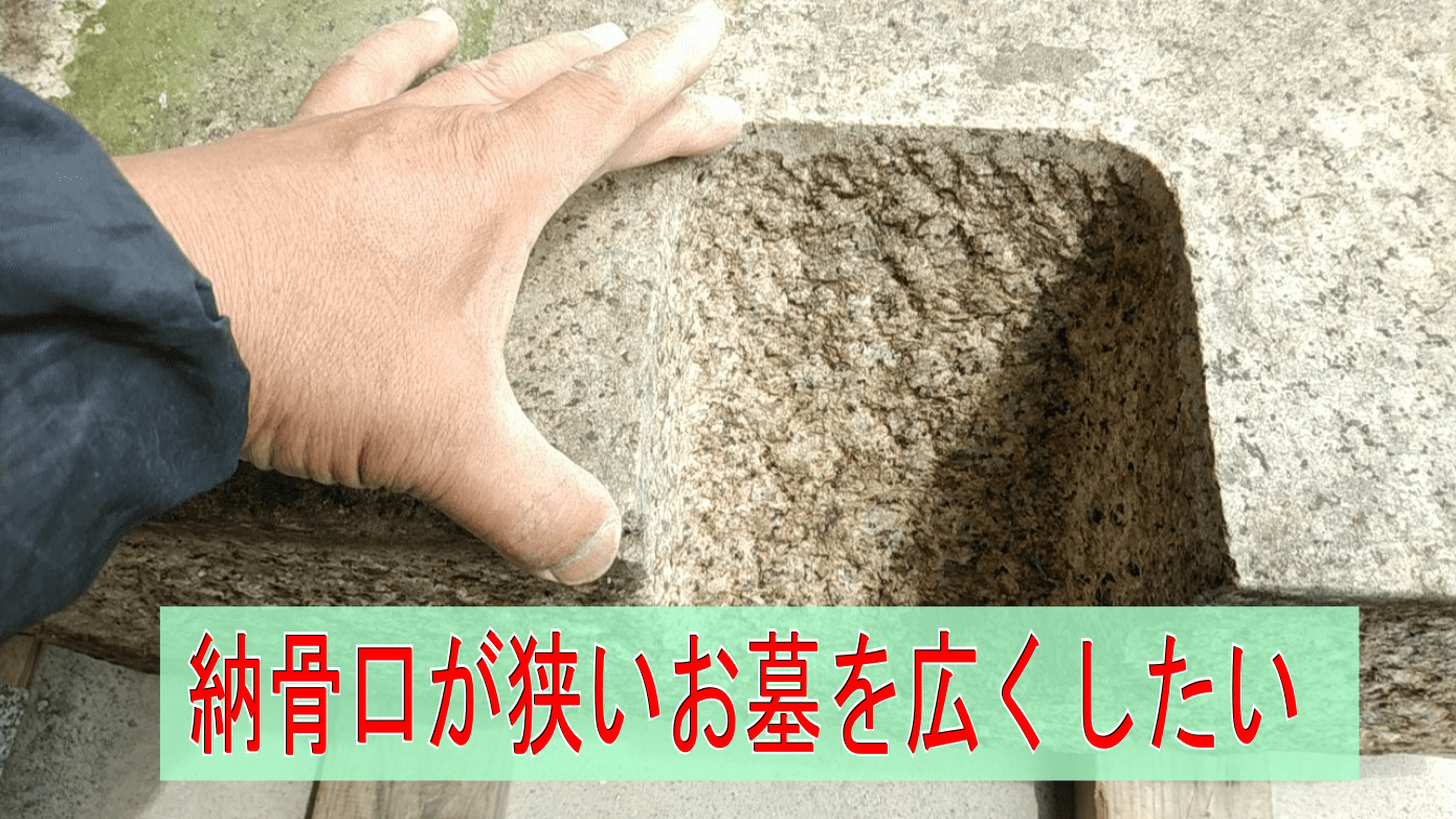 さて、古いお墓って、傾向として納骨口が狭い場合が多いです。このお墓も非常に狭く、4号の骨壺が無理して入るかどうかという大きさでした。関西でも最近は大きくなる傾向があり、5号、6号も見かけます。でもこのサイズではまず無理ですね。