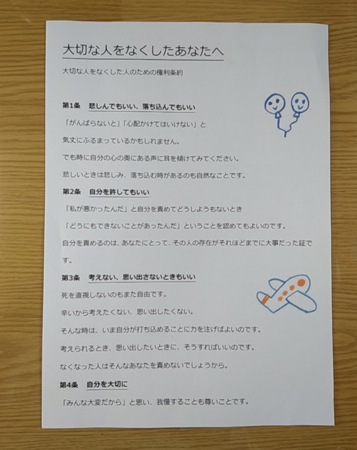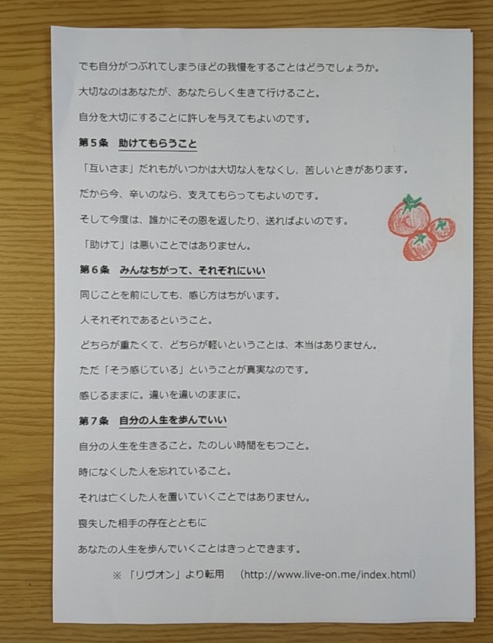 ちなみに、このこのリヴオンが提唱している 「大切な人をなくした人のための権利条約」というものがあるのですが、おおきた石材店のお客様にお渡ししています。