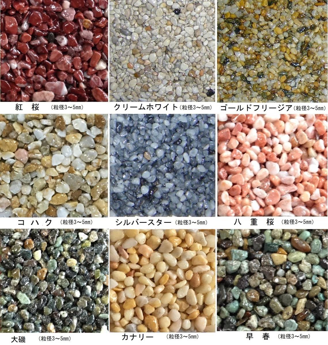 非常に多くの色があり、鮮やかな色をしていて、魅力的です。自分の好みに合わせて施工することができます。また、樹脂舗装の特徴として、濡れ色に近い鮮やかな仕上がりになってその石の独特の色目を強調するので、余計魅力的でもあるのです。