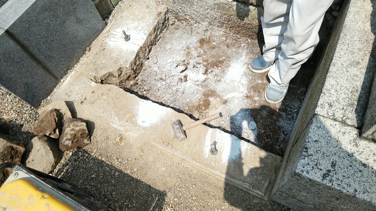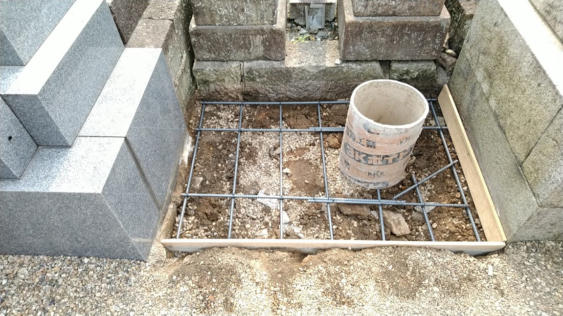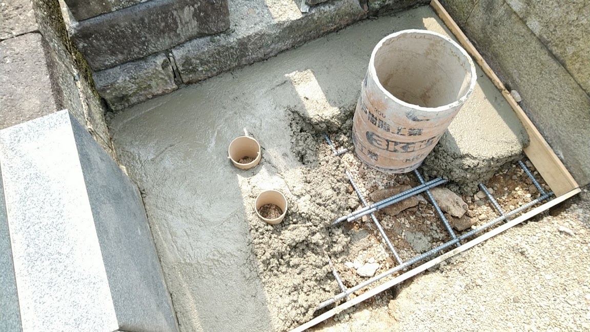 お墓工事の際、お墓を移動したら、新しくお墓を設置するときは、必ず新しいコンクリートを施工するのが基本です。何か不要なモノ(石とか古いコンクリートとか)があったら、撤去し、まっさらの状態で砕石を入れ、転圧し、鉄筋を組んで、新鮮なコンクリートで固めるというのが、お墓工事の基本だと思っています。