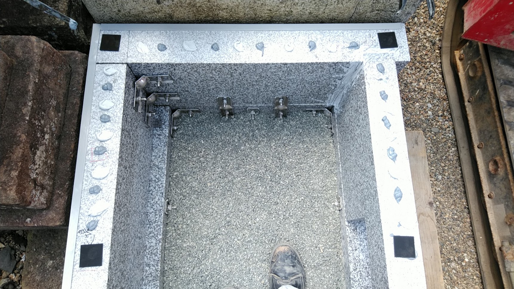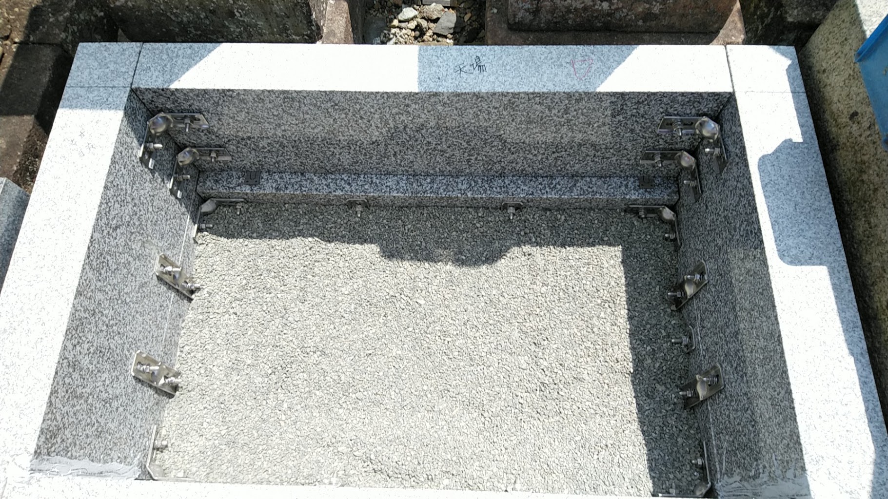 残念ながら、墓地内に雨水が入らないお墓の構造「信頼棺®」ではありませんので、天端石(天蓋石)は二つの石で組み合わせております。納骨口も「信頼棺」構造の納骨口ではありませんので、絶対に雨水が入らないとは言い切れませんが、まあ大丈夫でしょう。