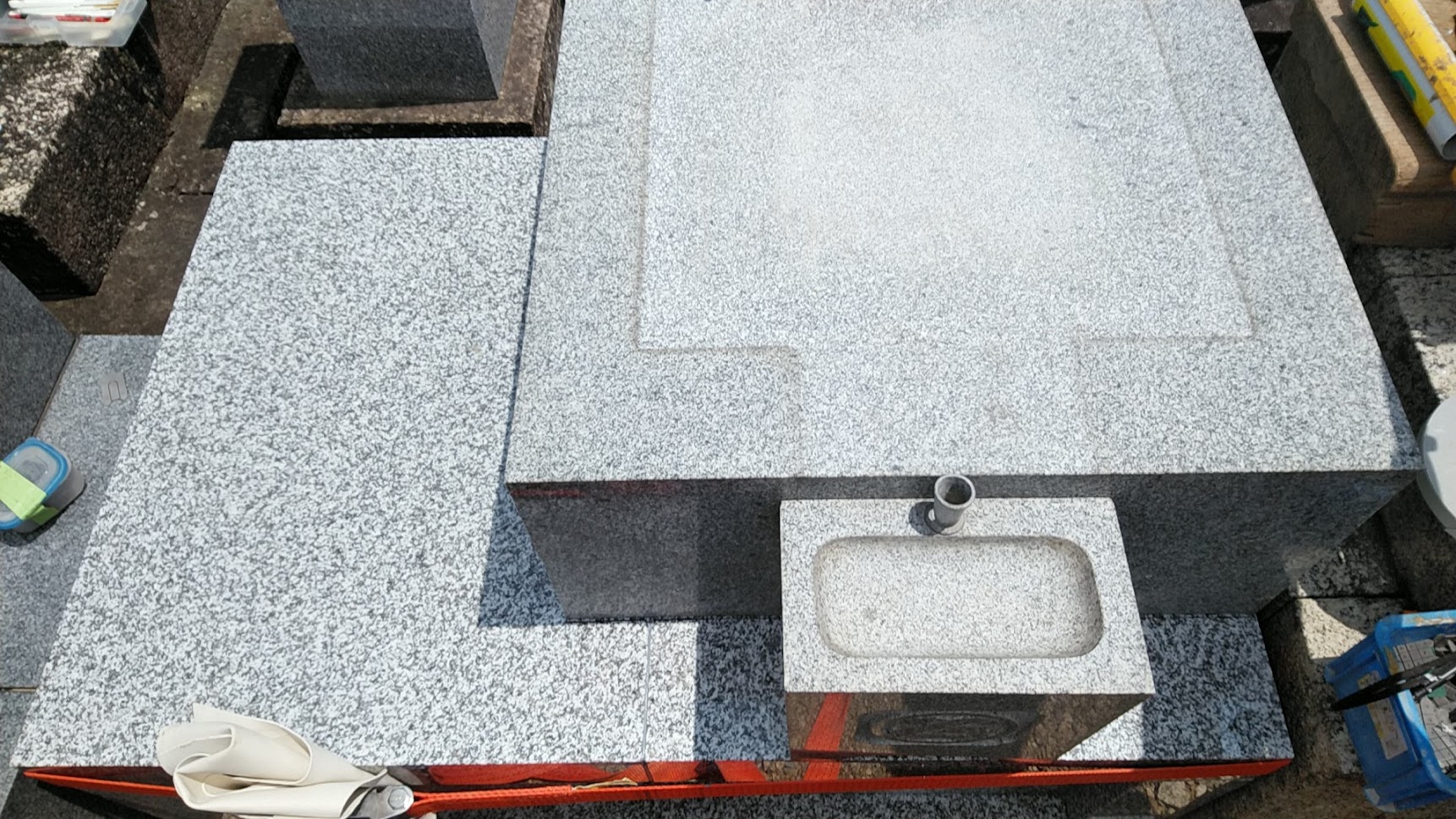 完成です。このバランスだと納骨口がかなり端に寄ってしまうので、通常の納骨口ではなく、舞台部分の下に納骨口を設けました。これでお墓のど真ん中に、広く納骨することができます。大雨で中に水が入らないか? という心配もあるかもしれませんが、その心配は無用です。
