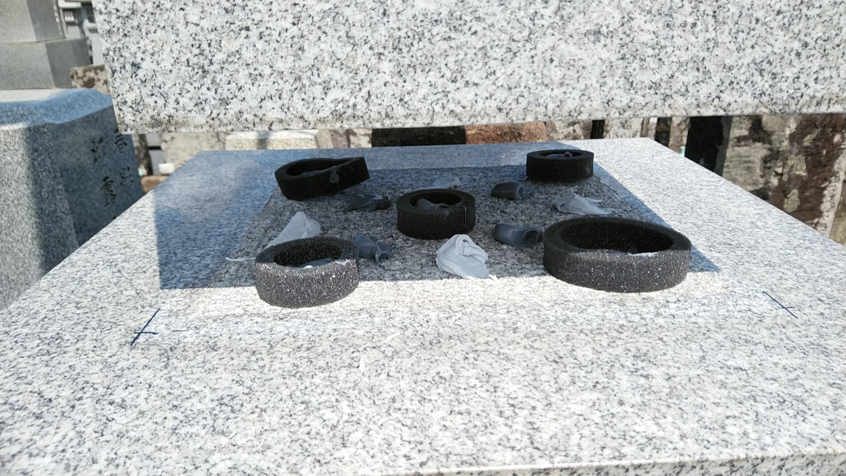 設置には、「礎(いしずえ)」ツールを使いました。おおきた石材店では「地震に強い施工」をさせていただいておりますが、(一部例外あり)その際、墓石免震ツールの「礎(いしずえ)」を利用させていただいて、施工させていただいております。