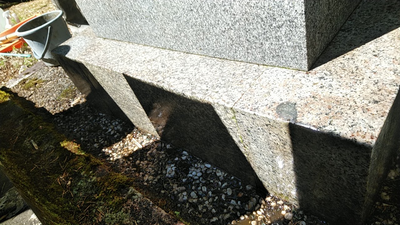 今回のお墓は、施工はけっこう古く、20年以上昔の施工です。ですから、下台(一番下の石)は磨いてありません。実は一番下の石はややピンク系のみかげ石なのですが、汚れて、黒くなっているので、全然わかりませんでした。
