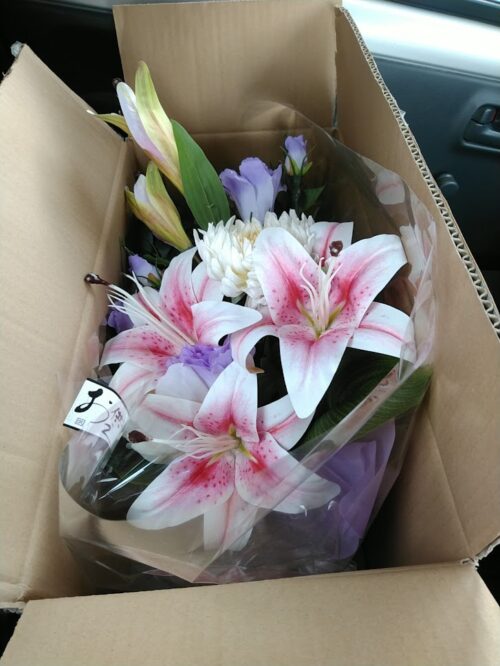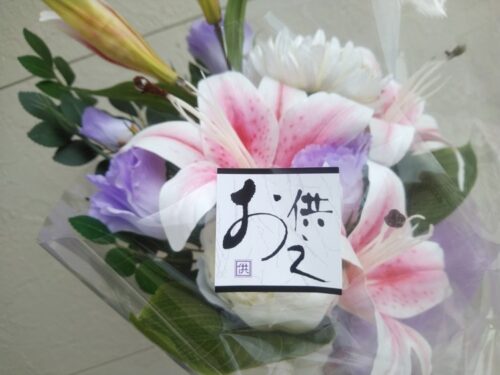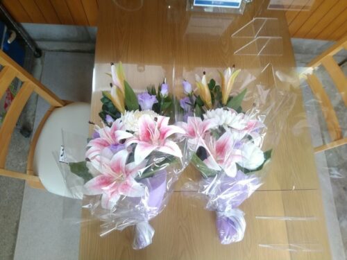 いつもお世話になっている岩田さんに「アーティフィシャルフラワー(造花)」の仏花を制作していただきました。