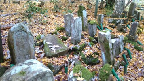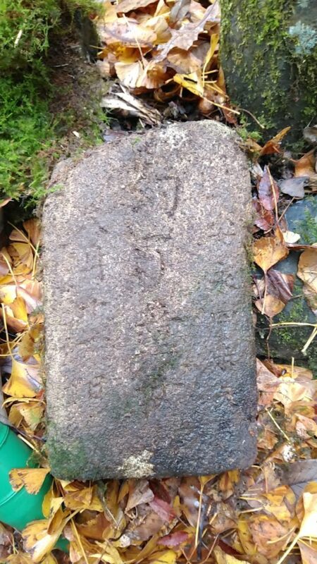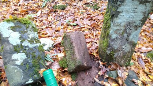 お墓とお墓の間に石が倒れているな、と思って、念のため表面の苔をはがしてみたら。。。お墓でした。。。
