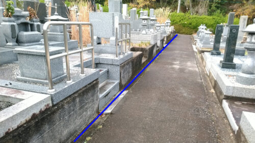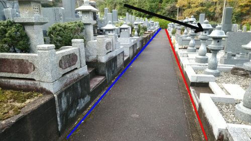 左から右へ下がっている区画です。青い線が引いてある側のお墓は低い方(谷)を向いて建っているお墓。