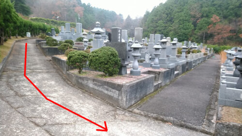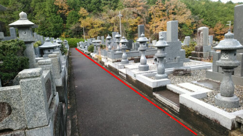 B区画(赤線で囲っている部分)のど真ん中に通っている通路。かなり広くて、私たち石材業者も利用させていただいているのですが、普通車ならすれ違いができる程度の幅があります。ですから、この通路の奥まで車で入って、止めてお参りするということが可能です。市道に車を止めるのは憚れるという場合でもここに留めることが可能なのはメリットです。