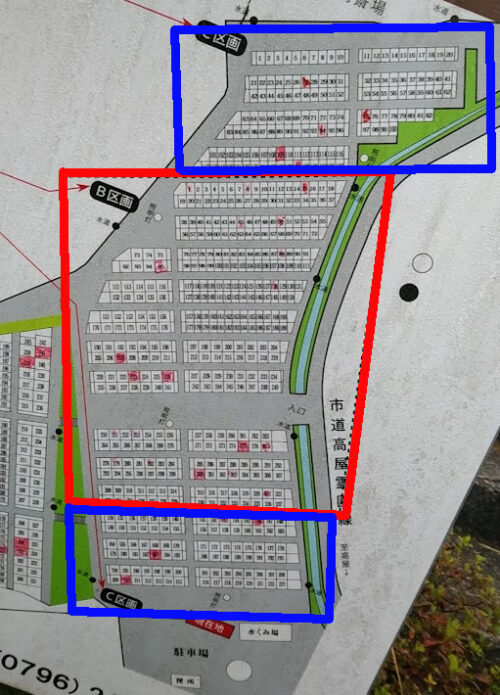 B区画は1~337番の墓地がありますが、(赤線枠内)6㎡の広さの普通の墓地と9㎡の広めの墓地が混在しています。6㎡と9㎡ではお墓工事の費用は当然違ってきます。