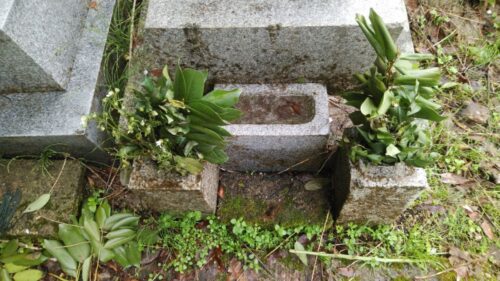 お隣のお墓も花立、水鉢と一通りそろっていますが、ずいぶん汚れていますね。