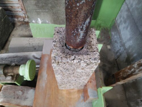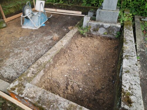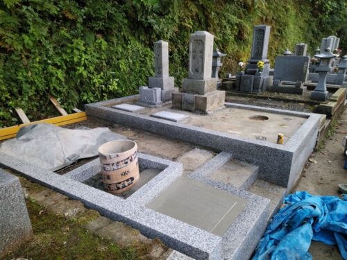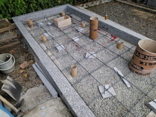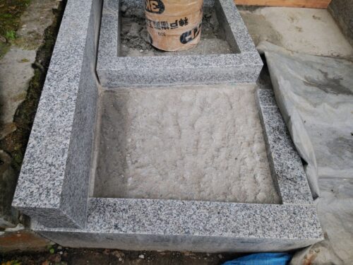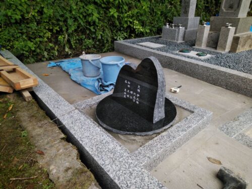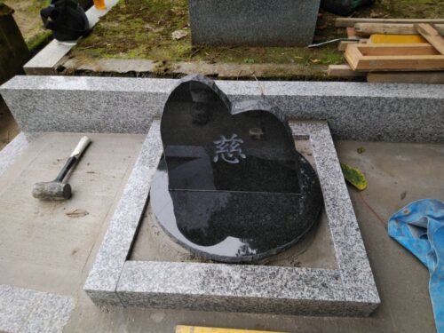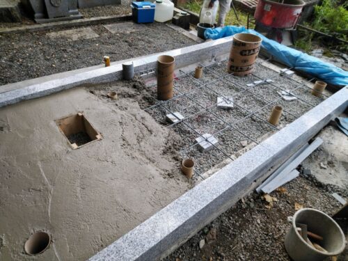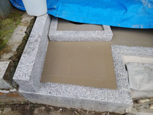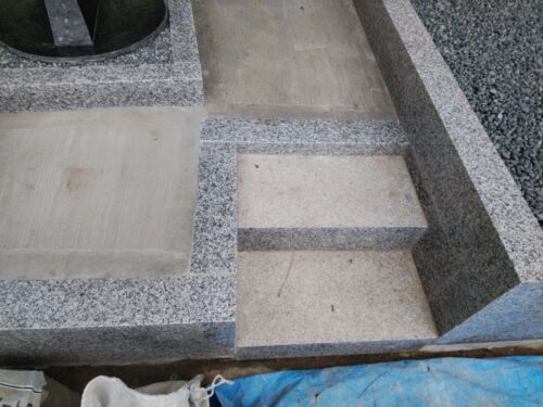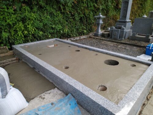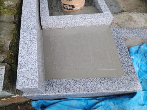 お墓の外柵に施工した基礎コンクリートが固まってきたので、持ち帰っていたお墓を再び建てます。