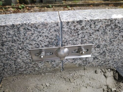 固定金具と接着剤(石材専用)を併用して、石同士を固定しております。下の基礎コンクリートとも結合しておりますので、ほぼほぼずれない構造ですね。ゴジラが破壊しない限り。。。