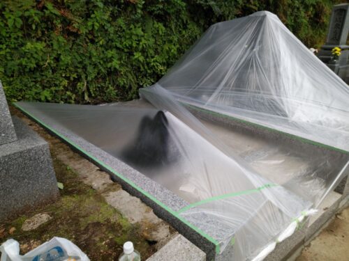 今度は一緒に。しっかりと施工しました。落ち葉の多いお墓なので、今度は落ち葉が落ちてきても大丈夫なように。。。