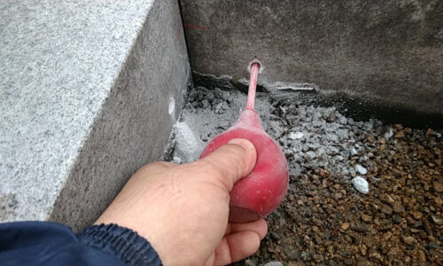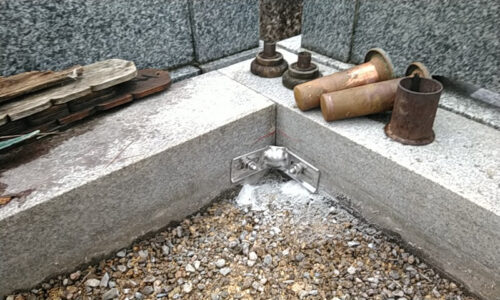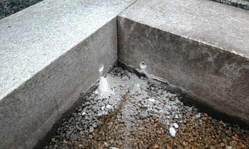 コーナー(カド)はこんな感じ。石同士をしっかりと固定。後ろも横もお墓があるので、この石がずれだすと周囲のお墓の石に当たって迷惑を掛けます。悪くすると保証問題も出てくるかもしれないので、固定をしっかりとします。
