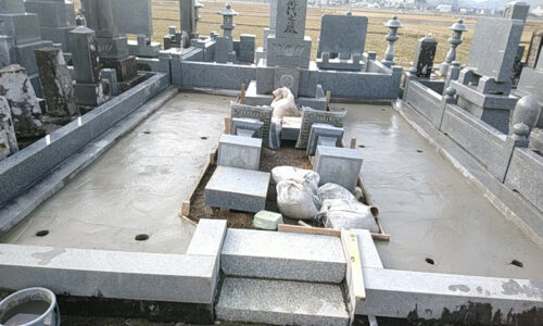 今回はお墓本体は触らず、副碑、ご先祖様のお墓、灯ろうといった比較的軽いものがその上に乗るだけなので、ベタ基礎はしておりません。真ん中の通路部分は後からコンクリートを施工します。