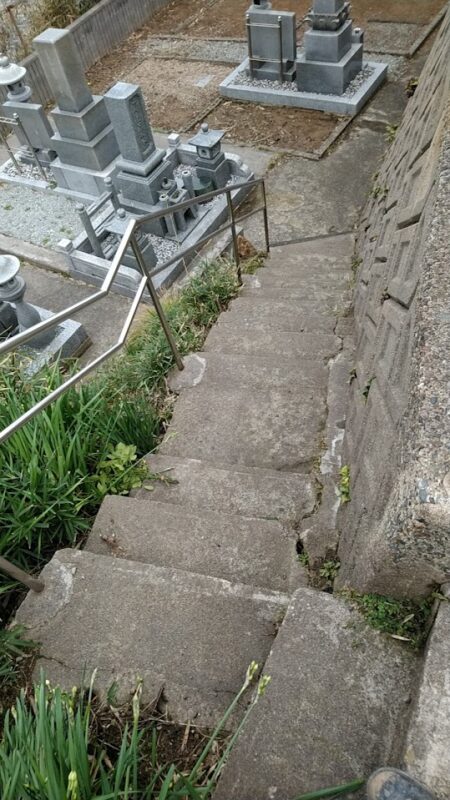こういう細い曲がった階段を通らないと墓地へ行けないので、機械や運搬車が通れません。全て人力に頼ったハードワーク。。。
