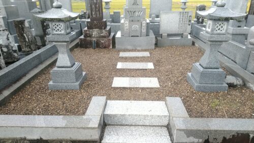 「代々墓」は今回、触らずにそのままで工事となりました。それ以外のお墓の中にあるものを全て仮に撤去。灯ろうだけは真ん中の通路部分に仮安置します。その後、墓地内の砕石を取り除いて、基礎工事。ご先祖様のお墓と二つの副碑を設置するための基礎コンクリートを設置。