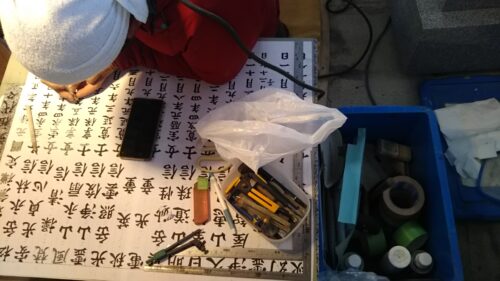 その後、雪が積もりだしたので、現場工事はとりあえずしばらく休止し、その間にたくさんのご先祖様の整理をして、その戒名や没年、名前等を新しい副碑(戒名碑)に彫刻します。