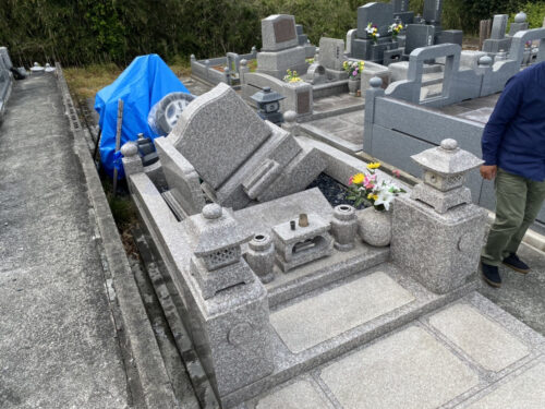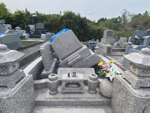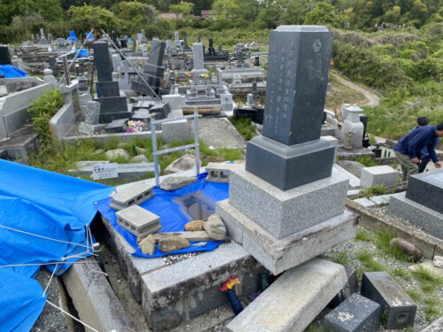 こちらは何とか落ちずに持ちこたえていますが、危険すぎる状態。施主の方がお墓がずれすぎてご遺骨が丸見え状態なので、ブルーシートで覆って見えない状態に仮対応されているようです。施主様のご心痛がよくわかります。