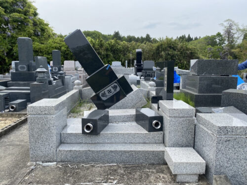 やはり背の高い構造のお墓ほど強い影響を受け、倒れていることが多い気がします。和型の立派な巨大なお墓ほど、倒壊しているイメージがあり、デザイン墓、特に背の低い、コンパクトなお墓ほど地震の影響を受けていないな、というのが実感です。