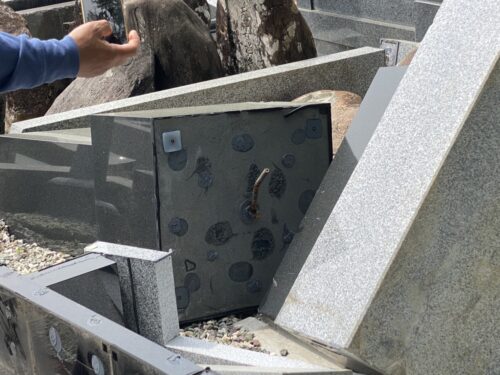比較的軽微ですが、お墓全体がずれてしまっていて、遺骨が見える状態になっています。
