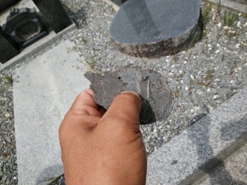 今回初めて体験したんですが、上の写真は別のお墓の倒壊した石に乗っていた(くっ付いていなかった)弾性接着剤のなれの果てです。こんなに硬くなるのか、というほどカチカチの個体になっていました。こうなると、もう接着性能なんて全く期待できないですね。