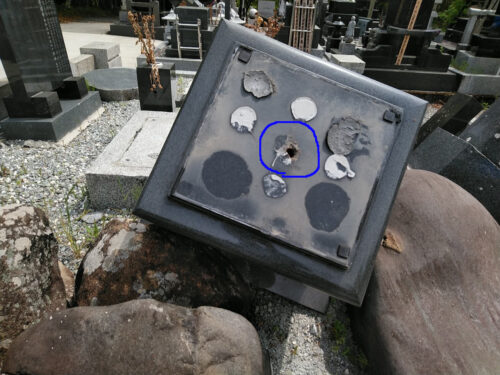 そして、真ん中に開いた穴。おそらく上の竿石に耐震ボルトを固定して、この穴に差し込んでいたと思われます。(写真の青線丸内)