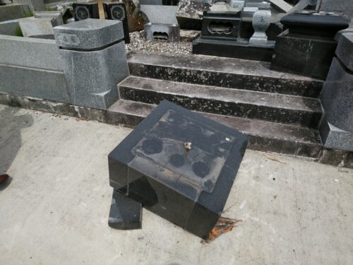正しく施工されたお墓は石と接着剤の分離が起きず、接着剤がちぎれるというほどの力も加わらなかったので、被害がほとんどなかった、という仮説もできます。
