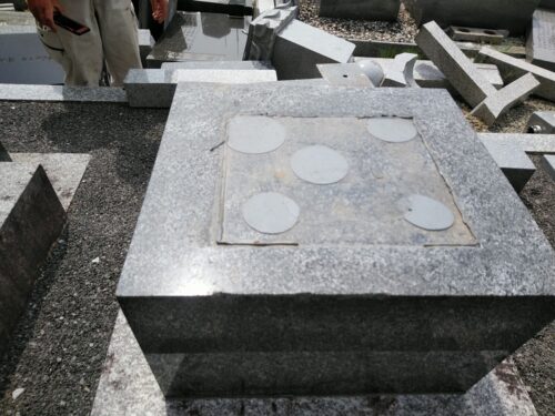 例えば、この写真。お墓の台石ですが、上の面に黒い円状のものが接着剤の跡だと思われますが、残っています。恐らく6点に接着剤を使われているはずです。