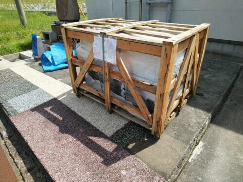 最近のお墓は木材で梱包されて、船便で日本にやってきます。それをトラック便で石材店に運び込まれます。このような状態です。