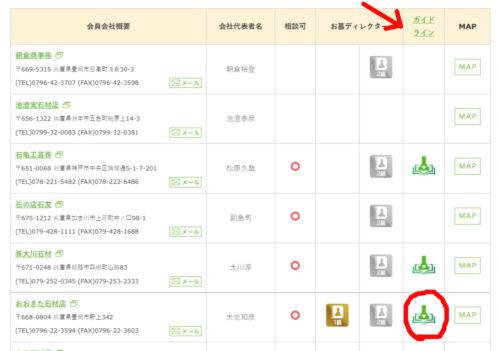 加盟店検索のページ。ガイドラインという項目の(赤矢印)部分にお墓のようなイラストが入っている事業者さんはガイドライン遵守事業者さんです。(赤丸印)