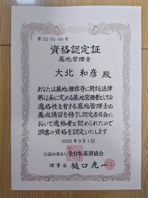 本来は「市町村、および県」の墓地行政を担当するものが取得するべき資格なのですが、石材店で取得している人はほとんどいない、と言える資格です。とても難しかったです。