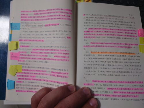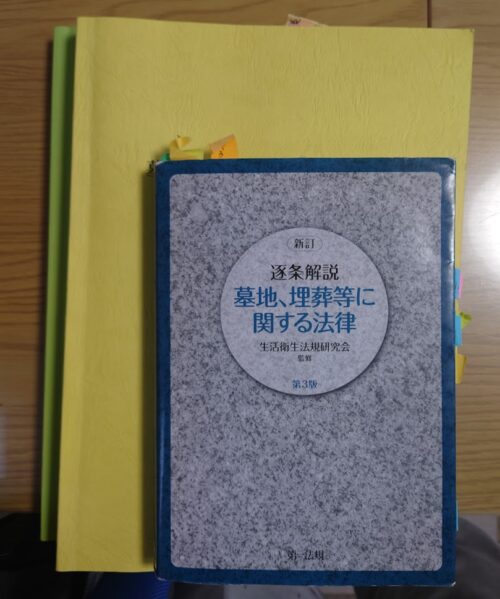 「墓地・埋葬等に関する法律」という法律は中身はそれほどなくて、第19条までしかない法律なんですが、それを補足するために担当省庁、今なら厚生労働省が各都道府県などに送った「通知」というものが75個あり、それらが法律に継ぐもの、として扱われるので、それを含めるとかなりの量となります。それらを一通り理解しなくてはいけません。