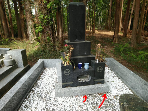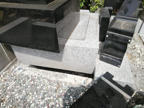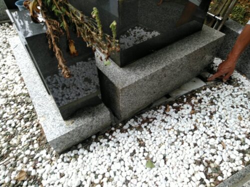 上の黒い石がずれて落ちそうになっていますが、よく見ると、下の白い石も動いてお墓の中が見えてます。下のコンクリートとの接着が十分ではなかったようです。