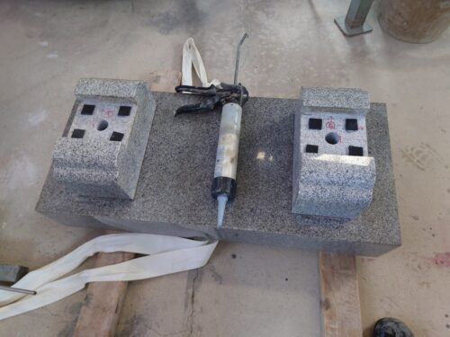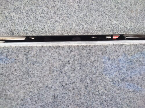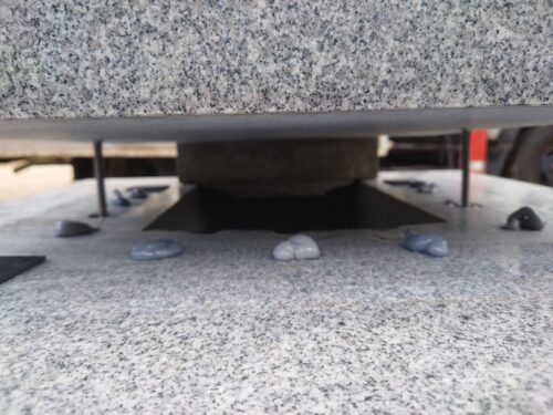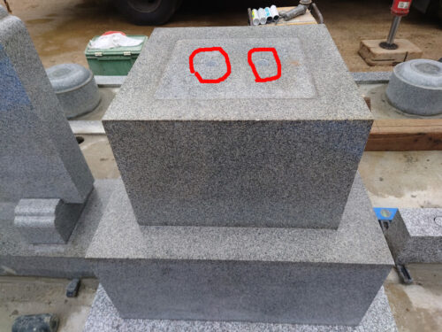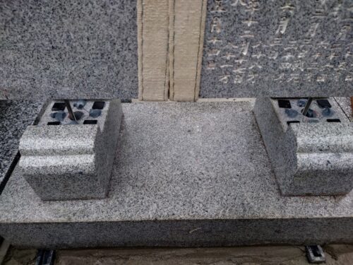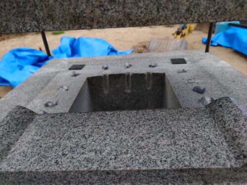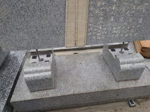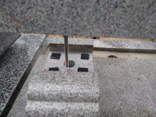 このように、戒名碑の足とその下の台にも穴を開けて、耐震ボルト(ステンレス製)を差し込めるように加工します。位置がズレると耐震ボルトが入らないので、注意が必要です。