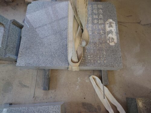 戒名碑の本体に耐震ボルトを設置。結構長いですね。足部分を貫通して、台にまで届いていないといけないので。。。