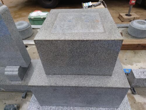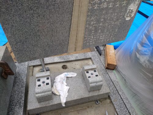 ただ単にお墓の石の上に石を置いてしまうのと、耐震ボルトを入れて、2種類の接着剤で耐久性を考えて設置するのとは全く異なります。でも、完成後の見た目は同じなのですね。