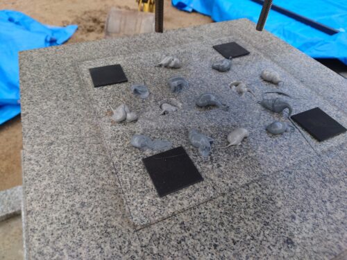接着剤とゴム板を挟んで、穴にはまるように竿石を降ろしていきます。