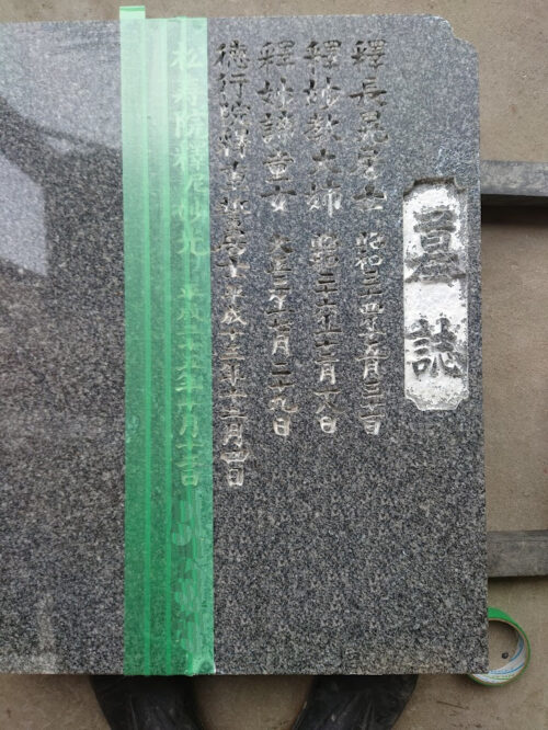 このように年月を経過すると白色が剥げたり、汚れたりして、読みにくくなります。また見た目も悪いですね。そこで、白を入れ直します。グリーンの部分は今回追加彫刻した部分です。