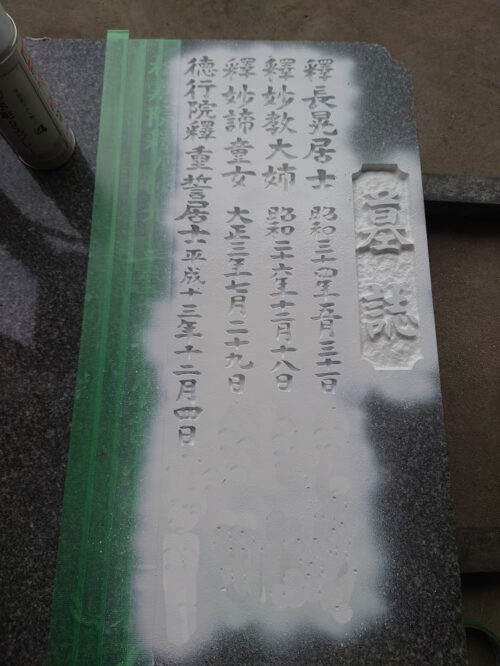 吹き付けた様子です。下の方、画像処理して見えなくしておりますが、文字が彫刻してあります。石の表面に直接吹き付けているわけではありません。こちらも専用の表面コートしていて、それを剥がせば、簡単に文字の白色だけ残る仕組みです。