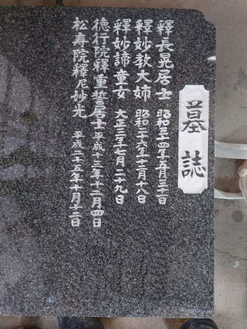 こちらが完成写真。一番左の方が今回彫刻させていただいた方です。このように少し黒系の石には、白色を、普通の白、グレー系の石には黒色を塗装して、文字を見やすく、美しくするために色を入れます。