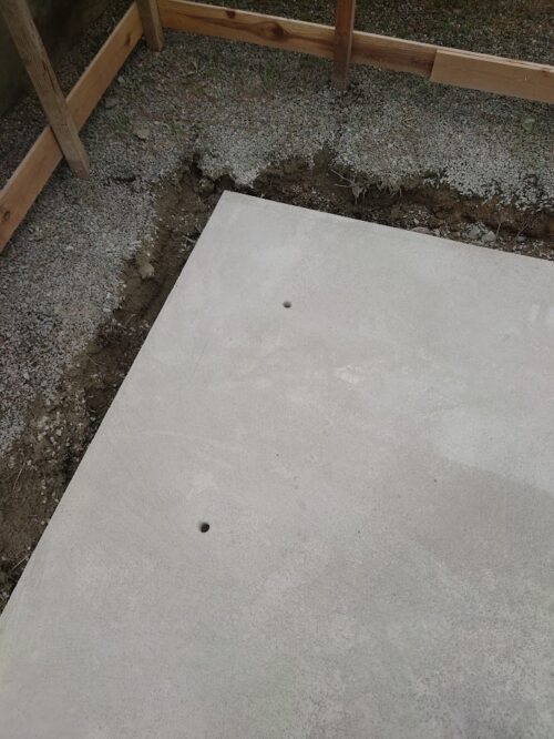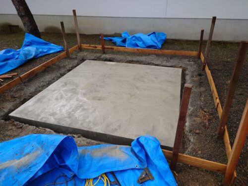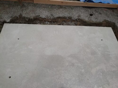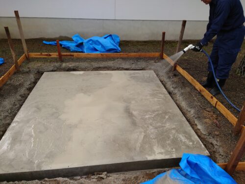 基礎コンクリートがある程度固まったので、型枠を外して、表面のレイタンス除去をした様子です。雨上がりだったので、レイタンスがうまく除去できたのか心配でしたが。。。