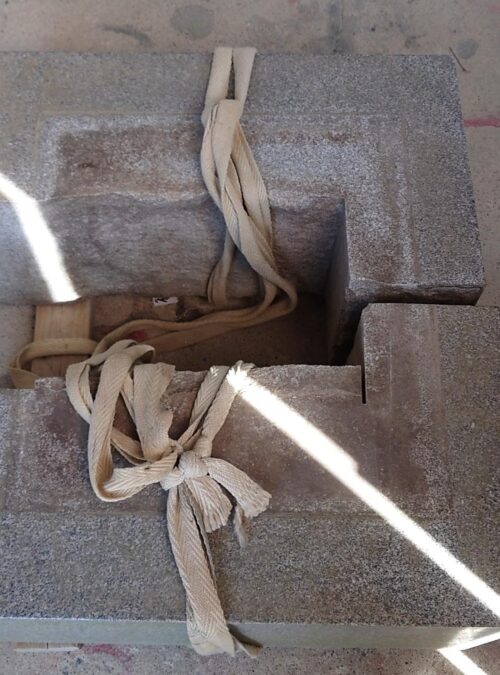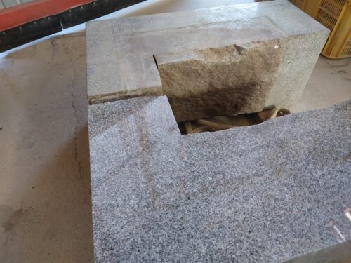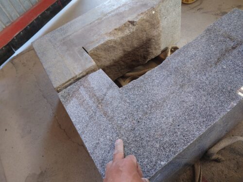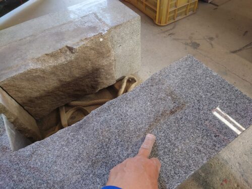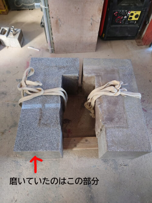 指で指し示した部分は完全には汚れが落ちていません。これは石の内部にまで汚れが侵入してしまっているためです。ここまでは落ちませんが、この部分は上の石が乗るので、完成後は見えませんので、大丈夫です。石って実は微細な穴が大量に開いているんです。だから、汚れが侵入してしまうと、なかなか完全に落とすということが難しくなります。石のメンテナンスが難しいのはこれが原因です。